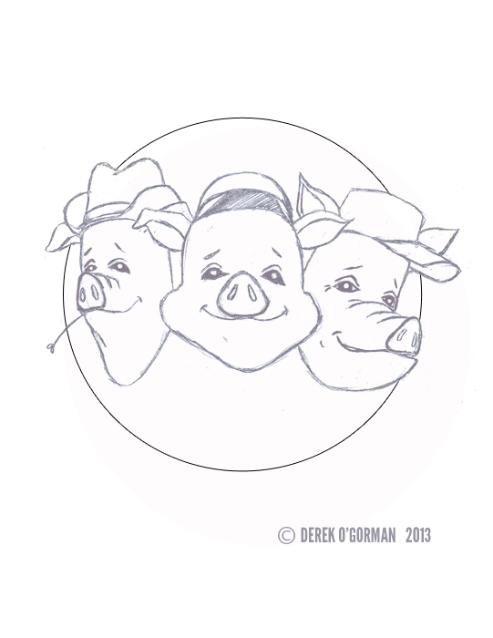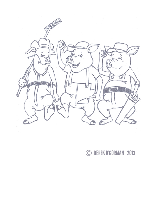 Pencils of the brothers merrily going off to build their houses in "The Three Little Pigs".