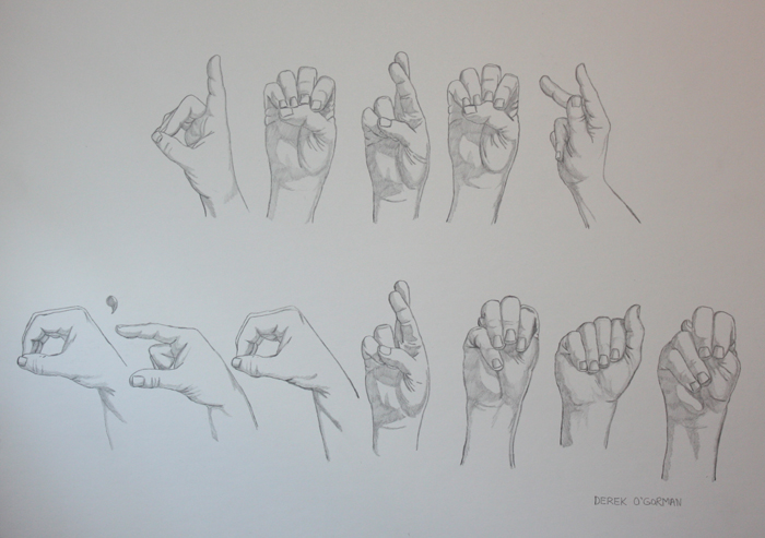 This is a pencil study of the various hand gestures required to spell my name in sign language.